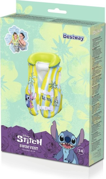 Dětská nafukovací plavací vesta ve veselém designu Stitche pro bezpečnost dětí s pohodlným límcem a dvěma nastavitelnými přezkami. Doporučeno pro děti ve věku 3–6 let. Velikost nafouknuté vesty je 45cmx33×16 cm.