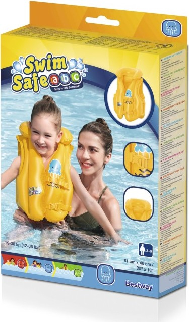 Nafukovací vesta pro děti od 3 do 6 let o velikosti 51×46 cm. 3 vzduchové komory, nafukovací límec, dvě nastavitelné přezky.