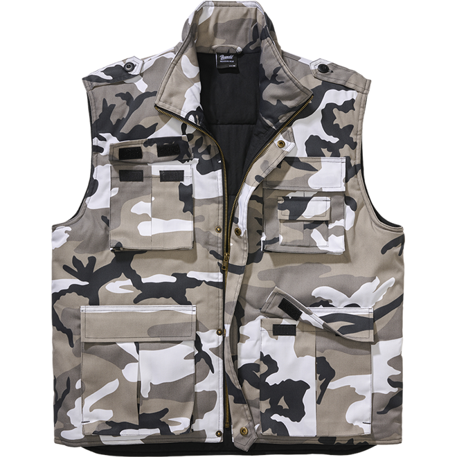 Pohodlná prošívaná vesta s mírně prodlouženými zády a velkým množstvím praktických kapes. Ideální pro chataře, chalupáře, rybáře a nimrody. vysoký límec - stojáček - pro ochranu krku zapínání vesty kovovým zipem krytým légou zapínanou na druky dvě velké průhmatové kapsy v pase kombinované se dvěma objemnými kapsami s chlopní na suchý zip dvě menší, ale stále objemné náprsní kapsy, zapínání chlopní se suchým zipem. Jedna z kapes členěna na dvě přihrádky a na přední straně má ještě malou kapsičku taktéž s chlopní na suchý zip vnitřní náprsní kapsa na zapínaná na suchý zip elegantní nárameníky s knoflíkem vesta má upravitelnou šířku v pase pomocí elegantních pásků se dvěma knoflíky mírně prodloužený zádový díl  prošívaná podšívka Materiál: 80 % polyester, 20 % bavlna, podšívka 100 % bavlna, zateplení 100 % polyester Hmotnost: 750 g (velikost S)   Výrobce: Brandit, Německo Kód výrobce: 4014