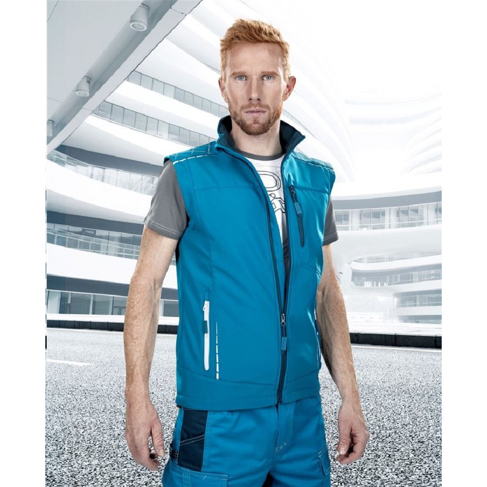 Vesta VISION H9176 pánská softshelová modrá funkční designová vesta vhodná pro montéry i jako vycházková vodoodpudivá a větruodolná díky technologii ElasticTech lehká a prodyšná zapínání na zip, 3 kapsy nastavitelný spodní lem reflexní potisk, ozdobný potisk na sedle materiál: 100% polyester, 285 g/m2, podšívka fleese barva: modrá, velikosti: S - XXXL