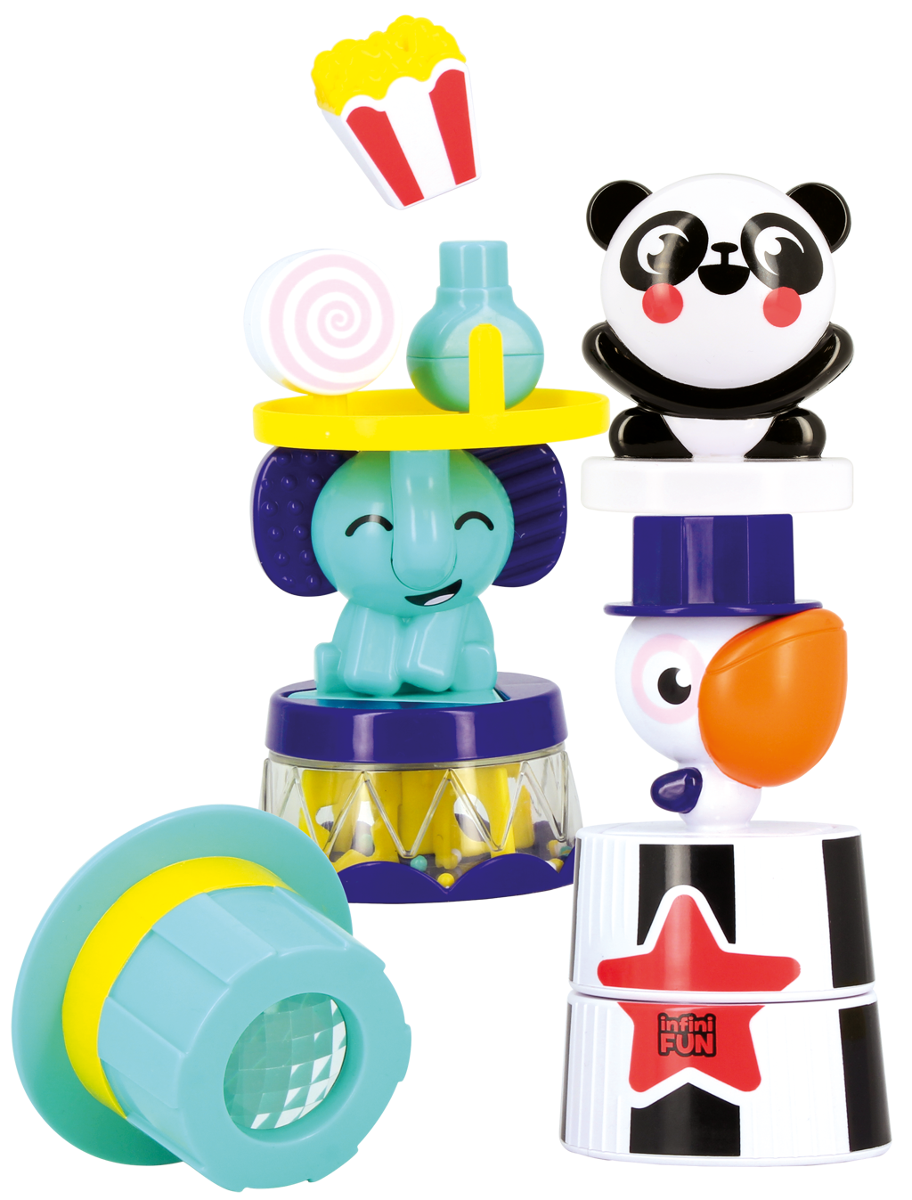 Skládací věž pro děti již od 18 měsíců. Věž je složená z několika různých částí ve tvaru zvířátek a kelímků.