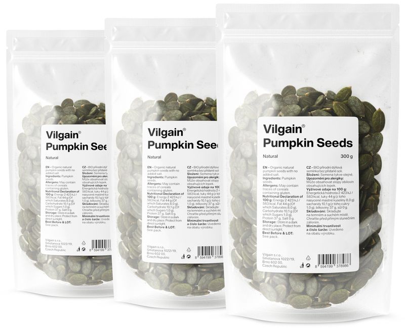 Vilgain Dýňová semínka natural je křupavá dobrota plná zdraví prospěšných látek. Semínka mají oříškovou chuť bez hořkosti.