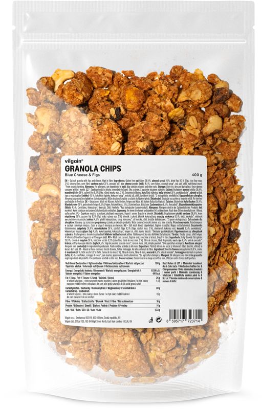 Domů Jídlo a nápoje Trvanlivé potraviny Cereálie a müsli Vilgain Granola Chips – Modrý sýr a fíky 400 g