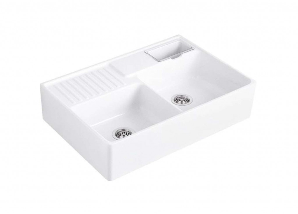 Kuchyňský dřez s manuálním ovládáním odtoku barva: Stone White - kamenná bílá materiál: keramika s úpravou CeramicPlus montáž: horní velikost skříňky: 900 mm rozměr dřezu: 895 x 630 x 220 mm bez otvoru pro baterii (2 otvory předchystané) bez přepadu ruční ovládání odtoku sítko na nečistoty