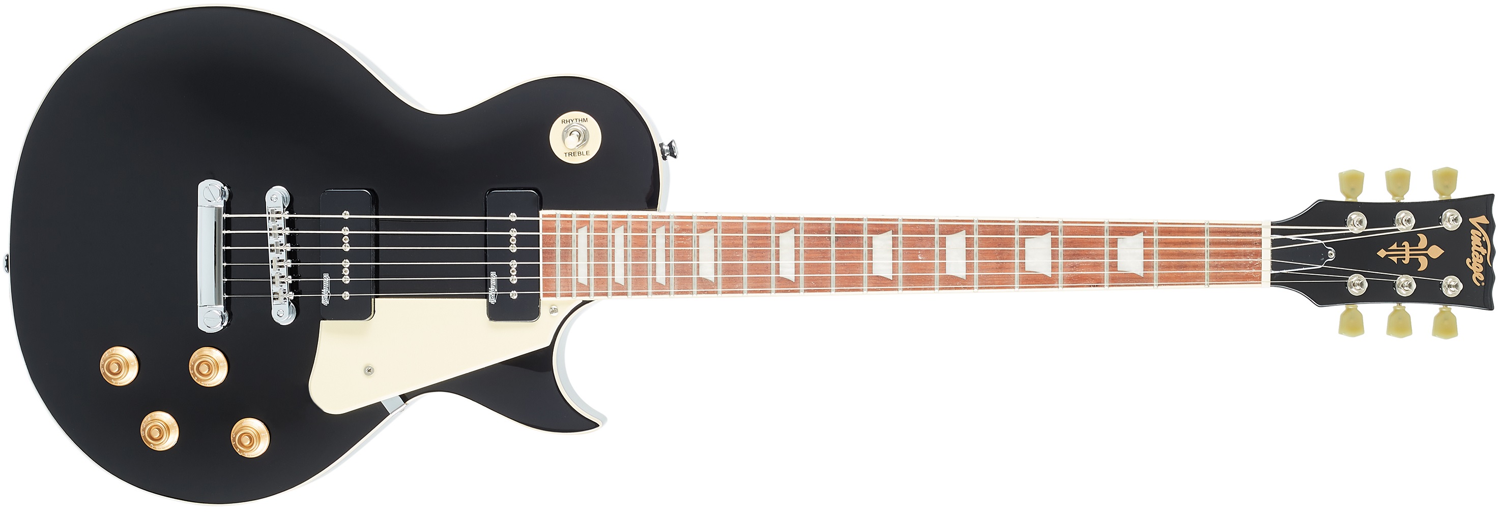 Elektrická kytara VINTAGE V100PBK je stylová elektrická kytara v LP single-cut designu s mahagonovým tělem, vyřezaným javorovým topem, barevnou úpravou Boulevard Black a stylovým lemováním. Dva snímače Wilkinson v soap-bar designu poskytují kytaře definované basy a průrazné středy humbuckerů i transparentní výšky klasických single-coil snímačů. Charakter zvuku lze tvarovat pomocí dvou ovladačů hlasitosti, dvou tónových clon a třípolohového přepínače snímačů. Nastavení si tak můžete přizpůsobit přesně podle