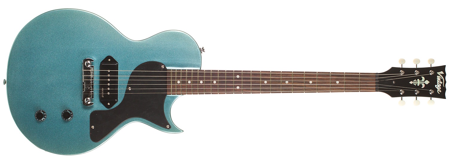 Elektrická kytara Vintage V120GHB je stylová elektrická kytara ve strohém single-cut designu modelů LP Junior z řady Vintage Reissued Series. Tělo nástroje je zhotoveno z mahagonu. K mahagonovému krku s příjemným “soft C” profilem je přilepen palisandrový hmatník osazený dvaadvaceti pražci velikosti Medium Jumbo. Kobylkový snímač značky Wilkinson v dogear designu poskytuje kytaře klasický průrazný zvuk single-coilů. Jeho kontury upravíte pomocí standardních ovladačů. Struny jsou ukotveny v mechanikách Wilki
