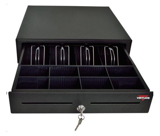 VIRTUOS Pokladní zásuvka C425D-Luxe černá / s kabelem / kovové držáky / kuličkové pojezdy / 9-24V (EKN0117)