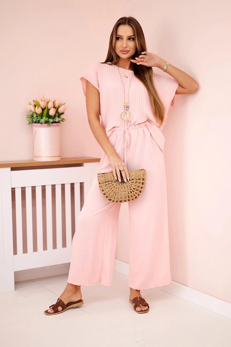 Objevte jedinečný komplet, který spojuje pohodlí a eleganci a vytváří dokonalý outfit pro každou příležitost. Vyrobený z lehké a prodyšné viskózy, poskytuje maximální komfort při nošení a zároveň vypadá velmi stylově. Plisovaná halenka s volným střihem jemně podtrhuje siluetu a dodává jí lehkost a moderní vzhled. Široké kalhoty dokonale ladí s halenkou a zajišťují volnost pohybu i elegantní vzhled. Celý komplet doplňuje ozdobný náhrdelník, který přidává jedinečný stylový prvek a eliminuje potřebu dalších doplňků. Tento set je ideální jak pro formální setkání, tak i pro každodenní nošení, kdy chcete vypadat elegantně, ale zároveň se cítit pohodlně. Vyberte si komplet z viskózy a užívejte si lehkost i nadčasový styl. Velikost je univerzální a vhodná pro ženy nosící velikosti S, M nebo L. VYROBENO V ITÁLII Složení materiálu: 95% viskóza, 5% elastan. Rozměry halenky: Šířka v podpaží: 50 cm Celková délka: 64 cm Rozměry kalhot: Šířka v pase: 31 cm / po natažení: 53 cm Celková délka: 96 cm Vnitřní délka nohavice: 63 cm Šířka v bocích: 56 cm Šířka nohavice: 34 cm Pokyny k praní: Před praním si vždy přečtěte pokyny k údržbě uvedené na vnitřním štítku. Prát při maximální teplotě 30°C, Žehlit při maximální teplotě 110°C, Nebělit ani nechlorovat, Čistit nasucho v benzínu, Nesušit v sušičce.