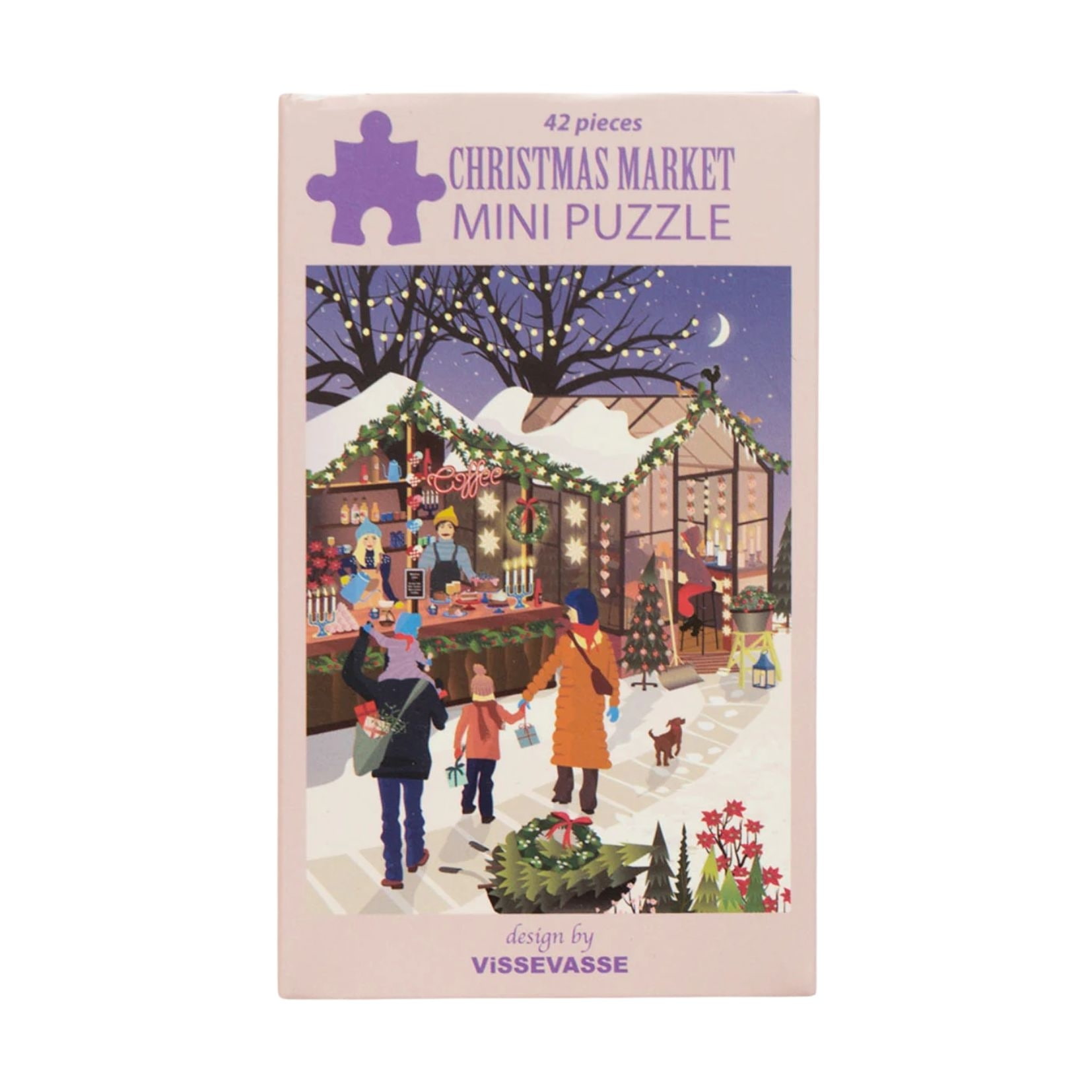 ViSSEVASSE Mini Puzzle Christmas Market 42 dílků, růžová barva, papír. Mini puzzle dánské značky ViSSEVASSE je skvělým tipem jak si užít krásný předvánoční čas. Doma, v teple s hřejivým nápojem a těmito 42 dílky, které po složení vypráví nádherný příběh z vánočních trhů, který voní vánočním kořením.
