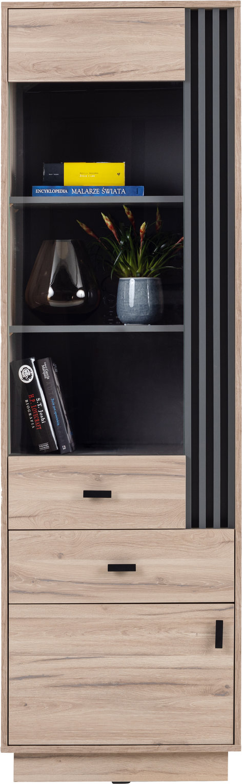 Vitrína AllMo AL3 • Vlastnosti: Materiál Jednotlivé komponenty ze sestavy AllMo jsou vyrobeny z laminované dřevotřískové desky o síle 16 mm. Prosklená dvířka. Hrany desek Hrany jednotlivých desek jsou opatřeny ABS lištou. Zadní deska Na zadní stranu jsou použity HDF desky. Úchytky Jednotlivá dvířka a zásuvky otevřete pomocí malého úchytu. Ozdobné lamely Ozdobené lamelami je nutno nalepit při montáži. • Barevné provedení Komponenty ze sestavy AllMo je dostupné v odstínu dub estena nebo kašmír. Obě varianty jsou doplněny o antracit. Dub estena + Antracit Kašmír + Antracit • Rozměry 195 cm celková výška 90 cm celková šířka 50 cm celková hloubka 16 mm tloušťka desky • Ložnicová sestava AllMo Zjistit více... Obývací sestava AllMo Zjistit více... • UpozorněníOdstíny prezentované na fotografiích jsou ilustračním materiálem, barvy se mohou lišit od vyobrazení na fotografiích podle nastavení vašeho zobrazovacího zařízení.