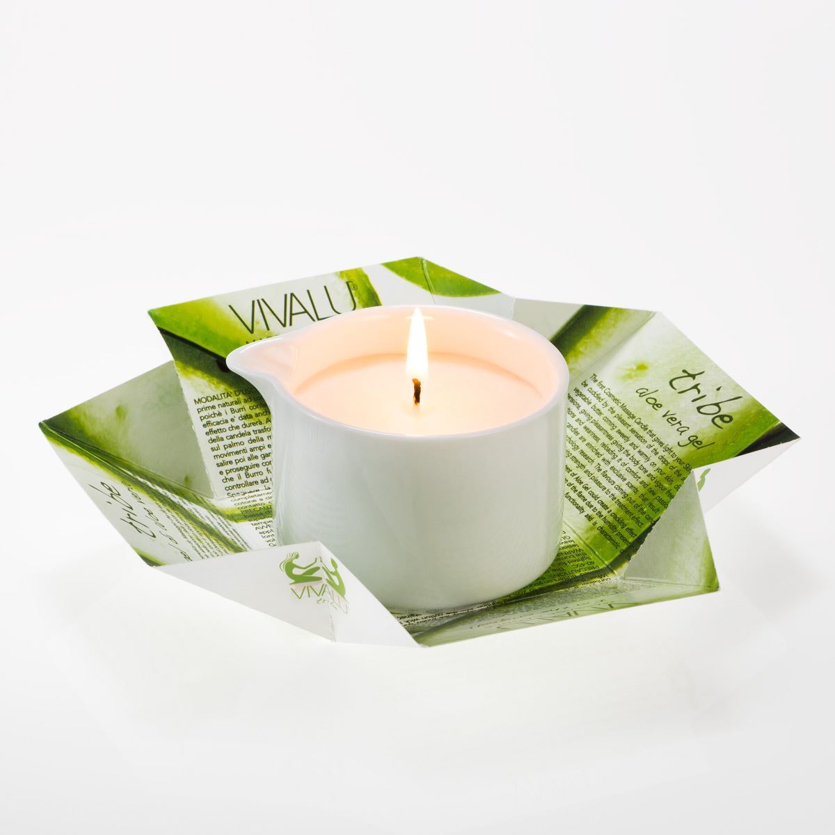 Vivalu Aloe vera gelová masážní svíčka 100 ml Pro regenerovanou a hydratovanou pokožku. Aloe vera gel je vynikající pro uklidňující a osvěžující masáž. Ideální pro citlivou pokožku. Díky svým vlastnostem je velmi vhodná k ošetření po voskování nebo po použití depilačního krému či holení. Uklidňuje podráždění a působí proti zarudnutí a nechává pokožku volně dýchat. Aloe gel má pro pokožku chladivé a uklidňující vlastnosti. Vivalu dodává léčbě výživu. Vynikající pro uklidňující masáž proti zarudnutí. Ideální pro citlivou pokožku. Upozornění: V této svíčce může vysoký obsah aloe gelu vytvořit během spalování praskavý efekt. Jde o přirozenou reakci plamene způsobenou vlhkostí obsaženou v aloe. Se svíčkou můžete udělat 2-3 masáže celého těla. Opakované nahřívání svíčky nemá na kvalitu masážní emulze negativní vliv. Dno obalu lze použít jako odkapávací desku. FSC certifikované ekologické obaly. Porcelánový džbánek je hygienický a praktický. Je navržen tak, aby odváděl přebytečné teplo, zamezuje plýtvání a umožňuje snadné dávkování. Jakmile je produkt spotřebován, džbánek se stává vyhledávanou nádobou pro další použití. Kosmetické a masážní svíčky poskytují možnost relaxace a uvolnění nejenom v kosmetickém a masážním salónu, ale i v domácím prostředí. Návod na použití: Svíčku zapalte a nechejte hořet přibližně 10 minut. Vonné a masážní oleje i esence se rozpustí a svíčka je připravena k použití. Nalijte masážní olej na masírované místo popř. do dlaní a můžete začít provádět relaxační masáž. Kosmetická a masážní svíčka VIVALU se využívá v masáži pokožky jako zvlhčující balzám, obsahující aktivní složky různých receptur. Zanechá pokožku na dlouhou dobu jemnou a vláčnou. Více masážních svíček a informací najdete na e-shopu la-griseo.cz