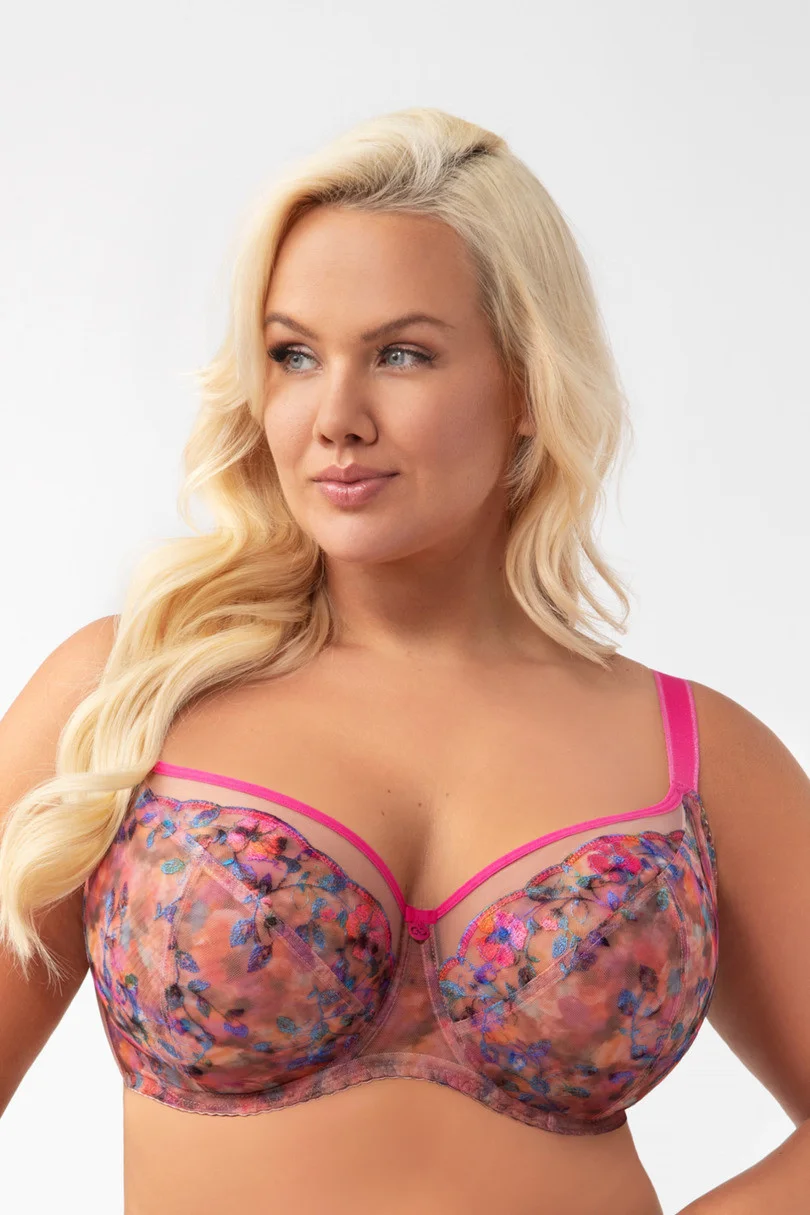 Biustonosz miękki przeznaczony dla kobiet ze średnim, dużym oraz bardzo dużym biustem. Zapewnia efekt bardzo mocnego uniesienia i zebrania biustu do środka, 3-częściowe miski wykonane z haftu oraz plenu haftowanego z nadrukiem na tiulu stabilnym. Górna krawędź miski wykończona taśmą w kontrastowym kolorze przechodzi płynnie do ramiączka powodując lepsze podtrzymanie biustu. Tył z transparentnej lycry zapewniającej bardzo dobre dopasowanie i podtrzymanie. Fiszbiny boczne zapobiegające zwijaniu się materiału. W zależności od rozmiaru dwu lub trzyrzędowa haftka z trójstopniową regulacją obwodu. Nieodpinane, regulowane ramiączka w trzech szerokościach.Metalowe elementy w kolorze różowym (nie zawierają niklu) Skład: 90% Poliamid, 7% Elastan, 3%