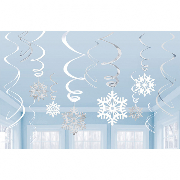 Vločky závěsné dekorace 12 ks Balení obsahuje: 6 ks spirály samotné, dále 3 ks spirály s vločkou o rozměru 12,7 cm a 3 ks spirály s vločkou 17,7 cm. Jde o jednotlivé kusy, které jsou v horní části opatřeny plastovým kroužkem - viz ilustrační foto. Kroužek je přerušený, takže je možné kroužek použít k zavěšení v prostoru. Pokud Vám chybí předměty, na které by bylo možné kroužek pověsit, můžete využít lepící gumu, samolepící závěsy (otvorem protáhnete průhledný silon a na ten dekoraci pověsíte) anebo obyčejnou průhlednou lepící pásku, kterou jednotlivé dekorace přilepíte ke stropu.
