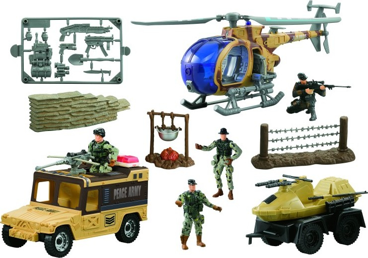 Vojenský hrací set představuje komplexní sadu určenou pro děti od tří let, které si rády hrají na vojáky a chtějí zažít realistické vojenské mise. V balení o rozměrech 50,5 x 21 x 29 cm se nachází pestrá kolekce figurek vojáků, vojenská vozidla v pískové kamufláži, helikoptéra s modrým kokpitem a různé doplňky, jako jsou zbraně, kulomet, obranné zátarasy a rekvizity pro táborový oheň. Všechny prvky jsou detailně zpracovány a barevně laděny do typických vojenských odstínů, což přispívá k co nejvěrnějšímu zážitku. Helikoptéra i vozidla jsou vybaveny funkcemi, které zvyšují atraktivitu hry – disponují pohyblivými částmi, světelnými a zvukovými efekty, které oživují celé scény. Vozidlo označené nápisem "Peace Army" působí robustně a je připraveno převážet vojáky i vybavení. Součástí sady jsou i zbraně a příslušenství, které lze připnout na figurky či vozidla, což poskytuje možnost přizpůsobit si herní scénáře podle vlastní fantazie. Balení je navrženo tak, aby bylo přehledné a zároveň lákavé, s průhlednou částí, která umožňuje nahlédnout na obsah bez nutnosti vybalení. Na krabici jsou vyznačeny základní vlastnosti setu v podobě ikon – přítomnost vozidla, osob, zbraní a dalších doplňků. Pro provoz světelných a zvukových funkcí jsou potřeba tři baterie typu LR44, které jsou součástí balení, takže hra může začít ihned po vybalení. Tento vojenský hrací set je ideální volbou pro všechny malé nadšence dobrodružství, kteří chtějí rozvíjet svou představivost a taktické schopnosti prostřednictvím interaktivní hry s kvalitními a bezpečnými hračkami. Díky široké škále součástí a detailnímu provedení nabízí nekonečné možnosti pro vytváření vlastních příběhů a vojenských operací.