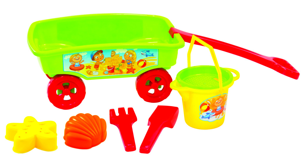 Veselý vozíček se sadou na písek je vhodný pro každého, kdo si rád hraje na pískovišti. Tato sada je laděna do pestrých barev a je vyrobena z kvalitního plastu. Obsahuje vozíček, kyblík, sítko, lopatku, hrábě a 2 bábovičky, takže je kompletně vybavena pro hravou zábavu na pískovišti.
