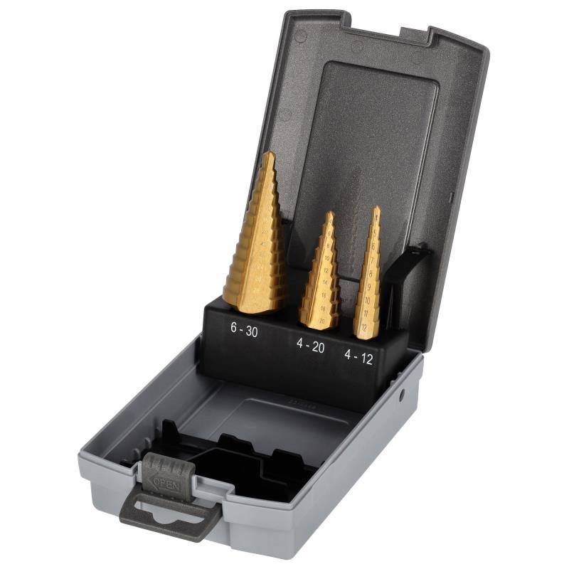 - sada třístupňových vrtáků o průměru od 4 do 30 mm. Strukturální povlak: TiN povlak z nitridu titanu