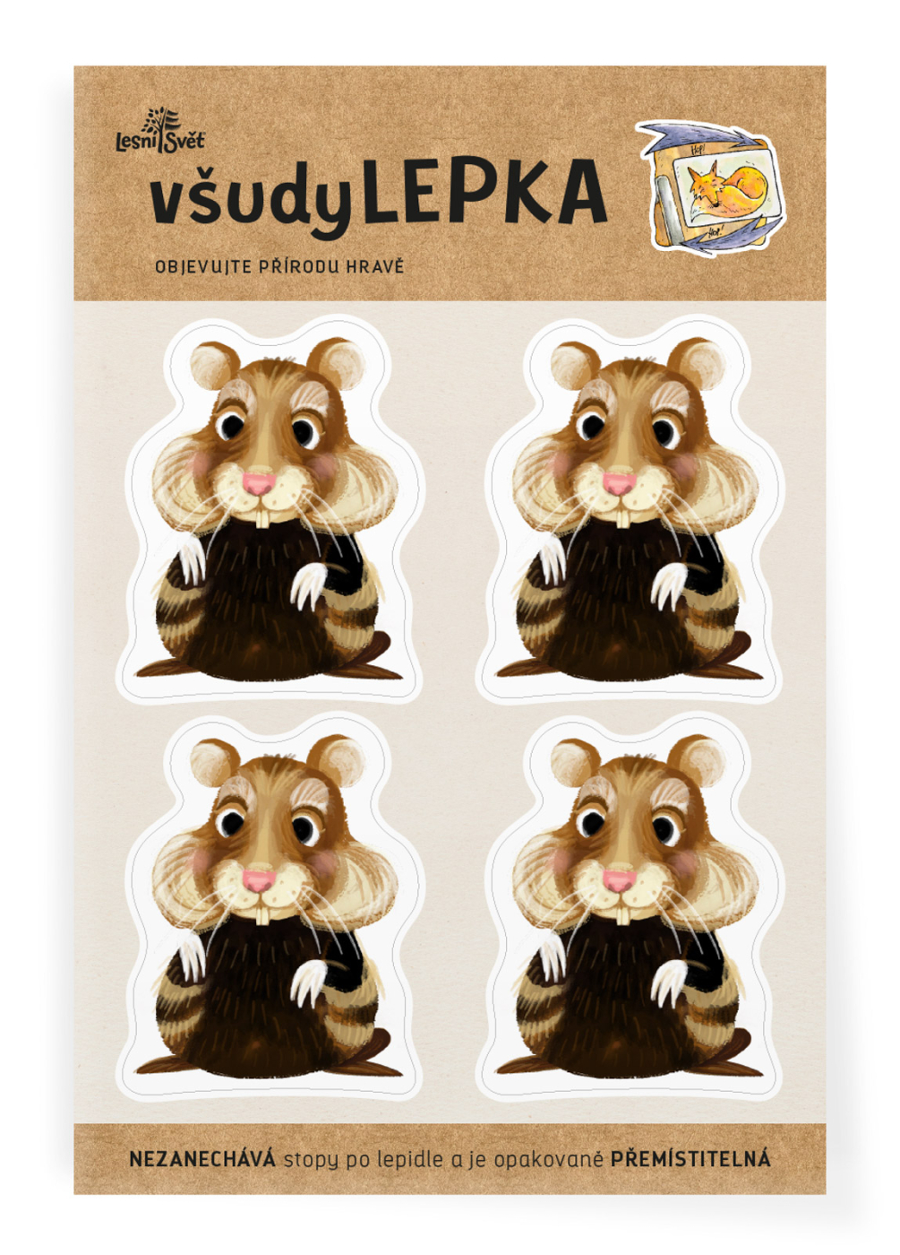 Lepí na stěnu, nábytek i sklo VšudyLEPKA nabízí nekonečné možnosti pro hru a učení doma, ve škole, nebo třeba v družině. Připravíte s ní zábavné hry, vzdělávací aktivity, nebo využijete jako pomocníka při tvoření. Také je oblíbenou dekorací do dětského pokoje. Nezanechává stopy po lepidle. Lze ji opakovaně přemisťovat z místa na místo. Pevná a odolná. Šetrná ke všem povrchům. VšudyLEPKY jsou také oblíbeným pomocníkem pro třídění a rozlišování ve školách, školkách, nebo doma mezi sourozenci. Obrázkem snadno označíte, komu patří skříňka, šuplík, nebo postýlka. A případně to také snadno změníte. VšudyLEPKA z Lesního světa Vzor všudyLEPKY: křeček Balení obsahuje arch s všudylepkami, rozměr archu: 24 × 16 cm Zabaleno v sáčku. Rozměr všudyLEPKY je cca 7,5 x 6 cm. VšudyLEPKY vyrábíme v Hradci Králové. Autorem kreseb jsou čeští ilustrátoři, obrázky jsou chráněny autorskými právy. Všechny výrobky jsou vyrobeny s ohledem na životní prostředí. Petita Kůsová, malířka a ilustrátorka Tvoří především dětské kresby a motivy. "Propojení dětské zvídavosti a hravosti s úctou k přírodě i lidem mi dává hluboký smysl." Více o Petitě Detail Detail Detail 10 kreativních tipů na práci s všudyLEPKOU Nevíte, co doma s dětmi? VšudyLEPKY vám otevírají možnost ke spoustě her a aktivit. Připravili jsme pro vás několik tipů. Ať už máte v plánu tvořit společně s dětmi, nebo je nechat pracovat samostatně. To mě zajímá