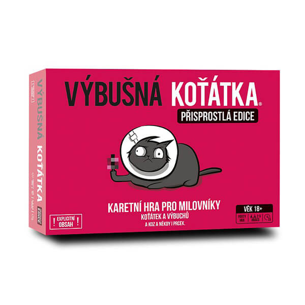 Výbušná koťátka - přisprostlá edice je samostatně hratelná verze jednoduché populární hry Výbušná koťátka a najdete v ní jinou, drsnější verzi obrázků. Pokud už máte původní verzi, obě můžete zkombinovat a hrát až v devíti hráčích. Cíl hry je prostý - snažíte se nevybouchnout. Hráč ve svém kole hraje libovolný počet karet a na konci svého tahu si jednu kartu dobere. Pokud je touto kartou explodující koťátko a hráč nemá, se jí zbavit, vybuchuje a vypadává ze hry. Hru velmi pěkně dotváří originální a vtipné ilustrace. V kombinaci se základní sadou Výbušná koťátka (Exploiding Kittens) lze s tímto rozšířením odehrát herní partii až v 9 lidech. Podívejte se na anglickou variantu hry Exploiding Kittens - NSFW Edition.