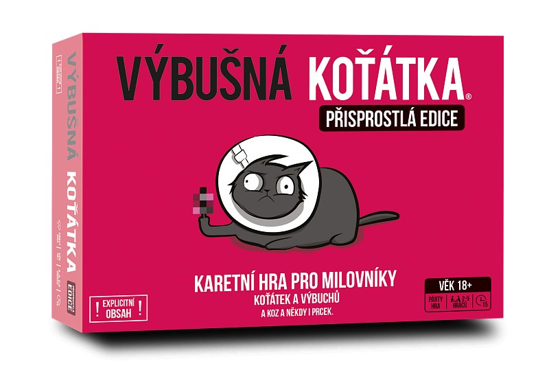 Výbušná koťátka jsou extrémně strategickou verzí ruské rulety (jen s koťátky). Hráči si dobírají karty, dokud si někdo nelízne Výbušné koťátko, exploduje, umře a je vyřazen ze hry. Pokud ten hráč nemá kartu Zneškodni, která mu umožní zneškodnit koťátko pomocí laserového ukazovátka, podrbáním na bříšku nebo sendviče s šantou kočičí. Úkolem všech ostatních karet v balíčku je pomoci hráčům držet se Výbušným koťátkům z cesty (nebo je nastrčit do cesty ostatním). V čem je tato edice jiná? Tato přisprostlá verze hry je peprnější verzí standardních Výbušných koťátek určenou pro dospělé od 18 let. Obsahuje úplnou verzi Výbušných koťátek, ale grafické zpracování jednotlivých karet bylo pozměněno a je tak natolik příšerné (nebo skvělé, záleží na vkusu), že prostě nemůže být součástí standardní edice Výbušných koťátek. Historické okénko Výbušná koťátka je hra s historicky nejvíce přispěvateli na Kickstarteru.Hru vytvořili Elan Lee (XBOX, ARGs), Matthew Inman (The Oatmeal) a Shane Small (XBOX, Marvel), kteří přepsali historii Kickstarteru, když v roce 2015 na jejich projekt přispělo více než 219 000 backerů (přispěvovatelů). K roku 2023 se prodalo více než 25 miliónů kopií Výbušných koťátek po celé světě. Přidáním dalšího herního balíčku (z klasické verze Výbušných koťátek anebo další přisprostlé verze) navýšíte počet hráčů až na 9. Obsah balení: 56 karet 1 česká pravidla