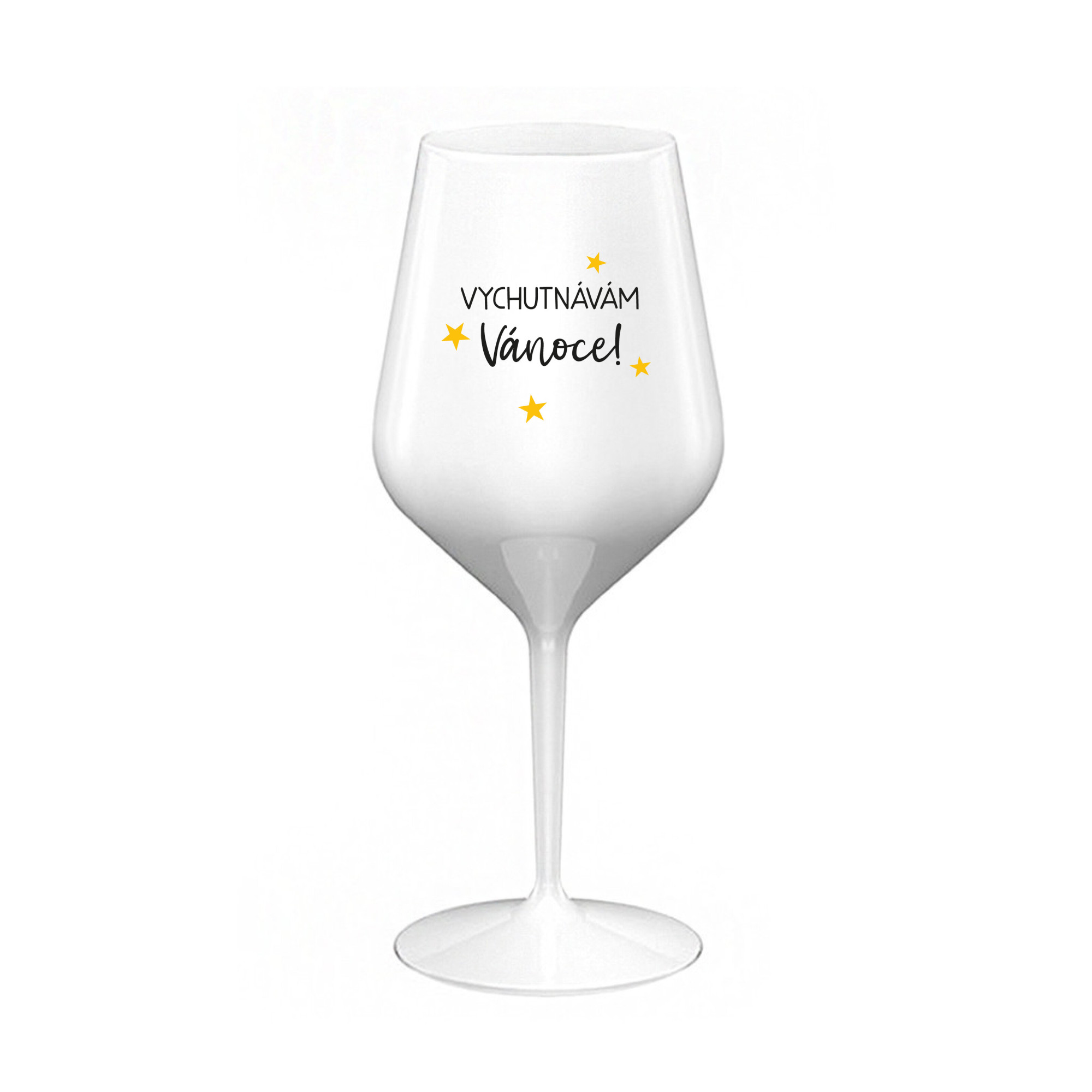 Nerozbitná bílá vinná sklenice s motivem VYCHUTNÁVÁM SI VÁNOCE je skvělá na zahradu, pláž, výlet, piknik a parádu udělá i při kempování. Jelikož je vyrobená z kvalitního polykarbonátu je de facto nerozbitná. Je to luxusní kousek, s nímž si víno můžete vychutnat prostě kdekoliv. Mají ergonomický tvar, který příjemně padne do ruky a protože je lehká, usnadňuje to její přenášení. Je snadno skladovatelná a lehce se čistí. Díky svému designu si s ní můžete vychutnat doopravdy kdekoliv bezproblémové pití výborného vína. Materiál PP. Vyrobené s láskou v ČR