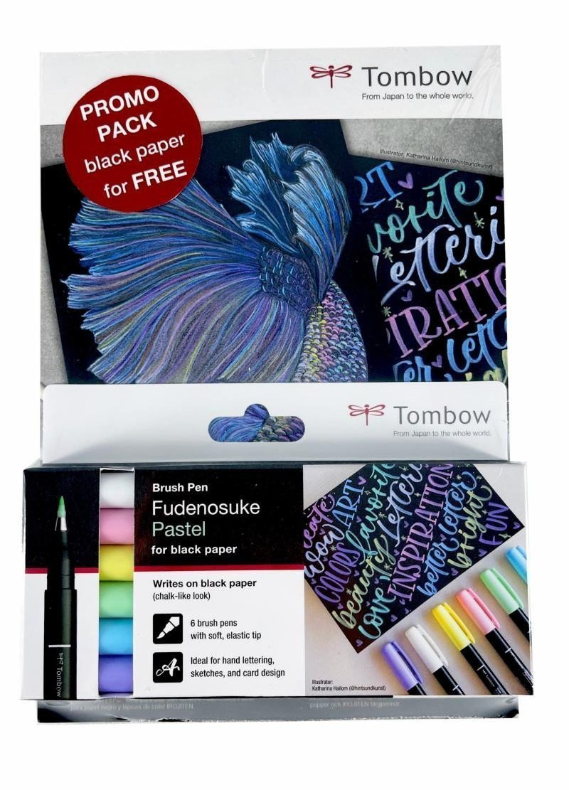 Výhodný balíček sady šesti štětcových fixů Fudenosuke pastel a bloku Tombow Black paper s patnácti listy černého papíru. Populární fixy Fudenosuke nyní dostupné také ve verzi vhodné pro psaní na černém a jiných tmavých papírech. Pevný, ale zároveň elastický štětcový hrot hravě zvládne tenké i tlustší linky. Měkká verze hrotu skýtá při psaní pocit mimořádné lehkosti a perfektně se hodí pro ručně psané nápisy, skicování nebo výrobu přání. Pět stylových pastelových barev plus bílá barva s úžasným křídovým efektem. Fixy jsou vybaveny „kouzelným“ pigmentovým inkoustem na vodní bázi: barva se objeví až pár vteřin po jejím nanesení na tmavý papír. Vrstvením inkoustu lze vytvořit intenzivnější barvy. Hodí se pro kombinování různých pomůcek, technik a materiálů. Skvěle se doplňuje s pastelkami IROJITEN, fixy ABT PRO a ostatními fixy Fudenosuke. Fixy lze používat i pro psaní na bílém papíře (výsledek vypadá jinak než na tmavém papíře). Skladujte ve vodorovné poloze.