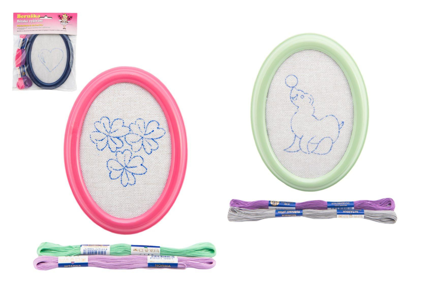Kreativní set na vyšívání pro všechny šikovné holčičky a malé švadlenky. Sada obsahuje plastový rámeček s napnutým plátýnkem s předtištěným obrázkem, dva další obrázky na vyšití a bavlnky. Sada v několika barevných kombinacích bavlnek a rámu, a v několika motivech obrázku.