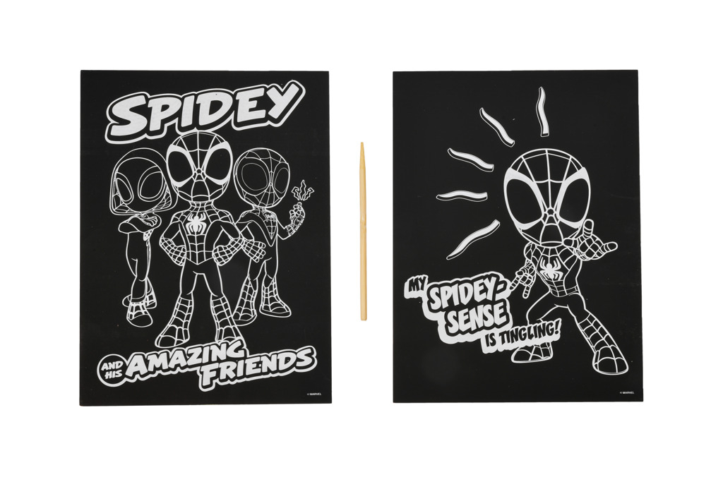 Vyškrabávací obrázky Spidy – balení obsahuje dva vyškrabávací obrázky a škrabátko.
