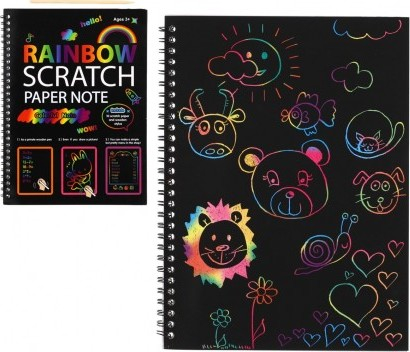 Kreativně se vydovádějte na vyškrabovacím notesu. Na jednotlivých listech můžete pomocí vyškrabovacího pera vytvářet různé pestrobarevné obrázky. Balení obsahuje notes 10 listů + vyškrabovací tyčinku. Rozměr notesu: 19 x 26 cm Vhodné od 3 let