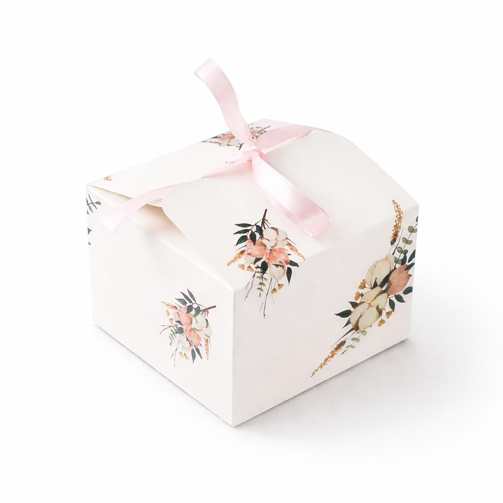 Papírové krabičky na zákusky nebo svatební výslužku v bílé barvě s potiskem by rozhodně na vaší oslavě neměly chybět. Do krabiček můžete po oslavě vložit sladkou výslužku z oslavy nebo dárek jako poděkování za účast. Rozměr: 11x11x7cm Pro velkoobchod cena za 10ks v balení.