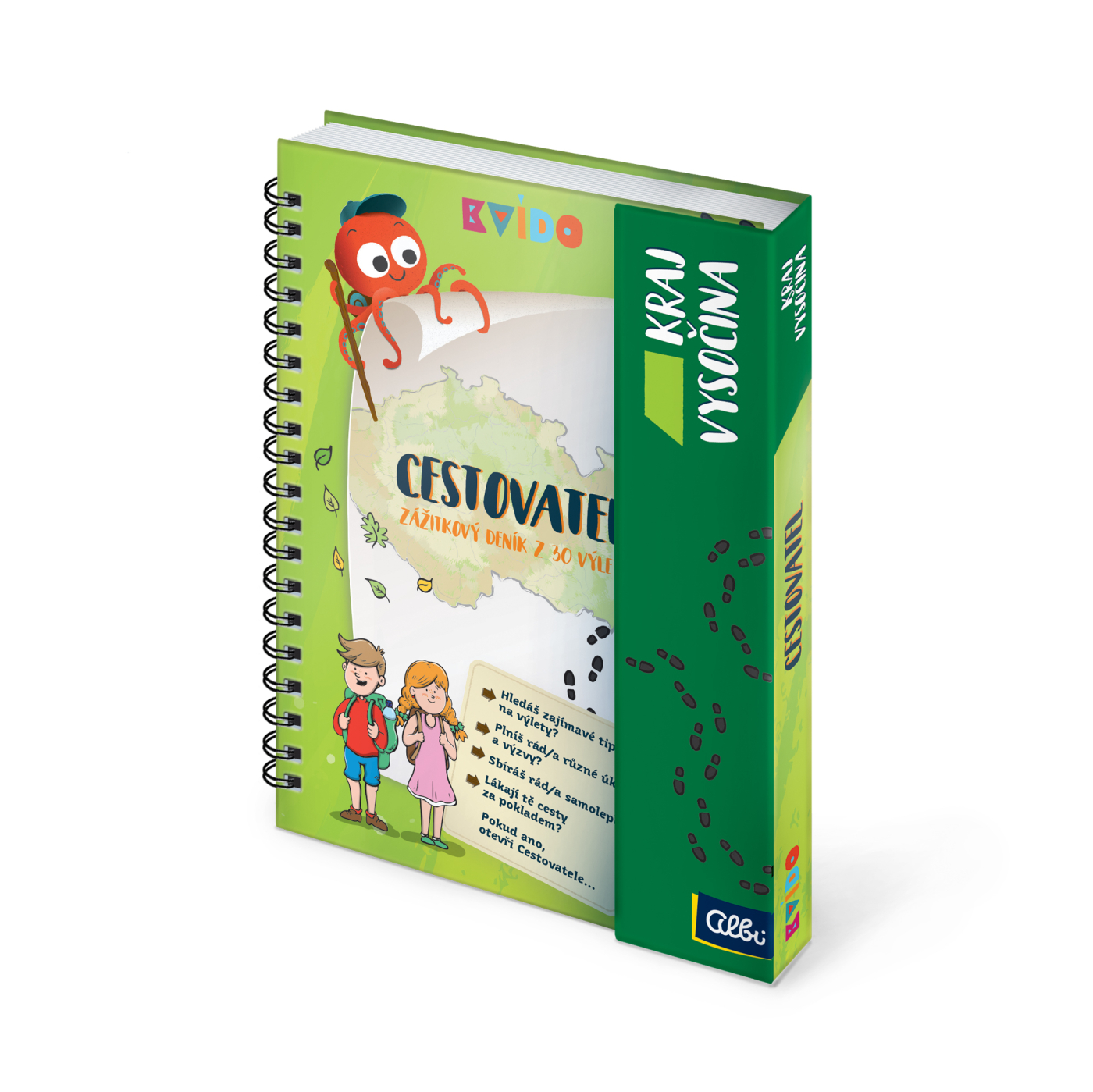 Procestujte s Kvídem celou naší republiku. Chobotničák Kvído vám zpestří každý výlet a postará se o zábavu v každém koutu České republiky. Každý jeho Zážitkový deník z řady Cestovatel obsahuje 30 zajímavých míst z daného kraje republiky. Cestovatelé od 4 do 12 let si tak mohou spolu s rodiči užít dobrodružné nejen léto. Každý Zážitkový deník obsahuje krátký popis, 2 lehčí úkoly pro mladší děti a 2 těžší úkoly pro starší děti. Součástí deníků je i tajná cesta za pokladem v přírodě. Děti v deníku najdou i přehlednou mapu kraje, tužku a samolepky, kterými si mohou značit, kolik výletů již podnikly. Deníky od Kvída mají kroužkovou vazbu a pevné desky s magnetickým zavíráním, aby se dětem v batůžku nepomačkaly. Rozměry: 15 cm × 18,2 cm × 1 cm.