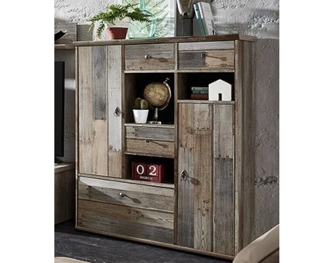 Vysoká úložná komoda ze stylové kolekce Bonanza - povrchy imitující vintage optiku oprýskaných dřevěných latí vnesou do vašeho interieru originalitu