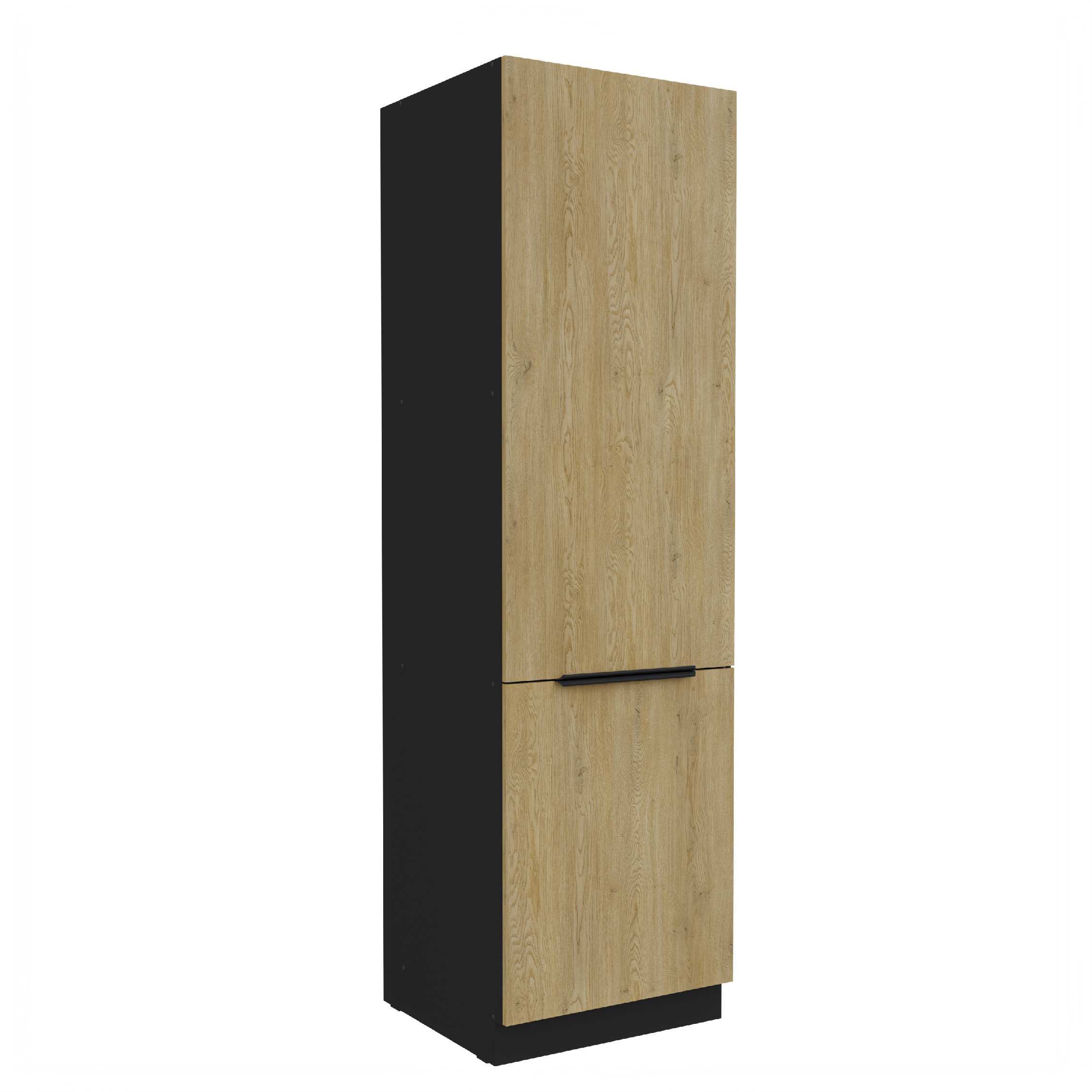 Vysoká potravinová skříňka Cremona 60 DK-210 2F Vlastnosti: Materiál Laminovaná dřevotřísková deska o síle 16 mm Zakončené hrany ABS hrana o síle 1 mm Úchyt Matný kovový černý úchyt Sokl Součástí balení Vnitřní barva Vnitřek skříně je bílý Vnitřní uspořádání Čtyři police Panty / Pojezdy Panty s tlumeným zavíráním Určení Potravinová skříňka • Barevné kombinace Černá a Dub Cremona Korpus a dvířka Bílá a Dub Cremona Korpus a dvířka • Rozměry:Šířka:60 cmVýška:210 cmHloubka:57 cmPočet balení:3 krabice • Odkazy na příslušenství ke kuchyňským linkámKompletní nabídka skříněk ke kuchyňské lince CremonaPracovní deskyPříslušenství ke kuchyním •