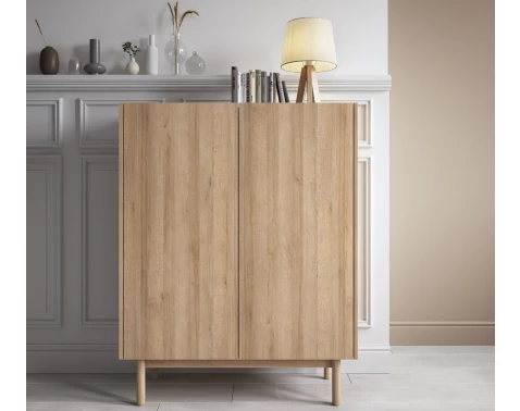 Vysoká skříňka z kolekce Boho - útulný a na pohled velmi zajímavý nábytek v dřevodekoru dub riviera zvýrazňuje dřevěná podnož.