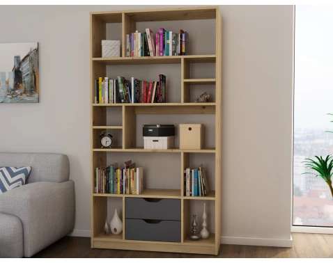 Vysoký moderní regál o šířce 100 cm v dekoru dub artisan/grafit má 2 praktické zásuvky a může být umístěn ke zdi nebo volně v prostoru jako předěl místnosti.