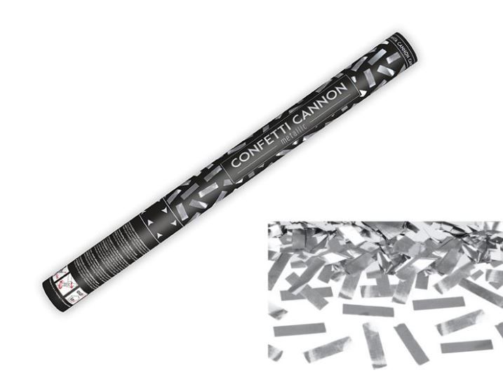 Konfety stříbrné vystřelovací - 60 cm. Stříbrné metalické proužky konfety 60 cm Konfety jsou uloženy ve válcovité tubě. Drží se v ruce a ovládají se mechanickým pootočením tubusu. Po vystřelení vyletí stříbrné metalické proužky do výšky 5 až 8 metrů a rozptýlí se do okolí. Iniciace: stlačený vzduch Tubus: kov Manipulace: pootočení Max délka odpálení: 8 m Bezpečnost: konfety lze použít ve venkovních i vnitřních prostorách. Bezpečná vzdálenost přihlížejících diváků od tuby konfet je 10 metrů.