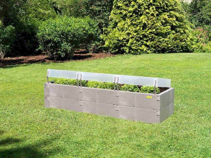 Vyvýšený plastový záhon (16 plastových kamenů) v šedém provedení. Rozměry: 190×60×52 cm. Plastový kryt na vrcholku záhonu poskytne rostlinám ochranu před nevlídným počasím. Tento model zvýšeného záhonu nemá pevné dno.