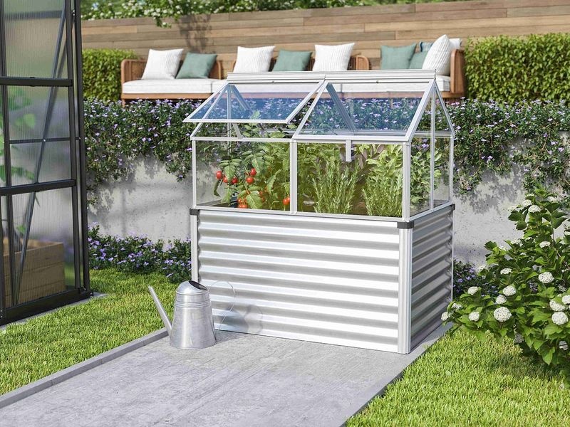 Středně velký vyvýšený záhon s pařeništěm, konstrukce z hliníkových profilů, rozměr š 122 x d 83 x v 137 cm, kalené čiré sklo 3 mm. Zakupte produkt Vyvýšený záhon s pařeništěm (LG3738) Vitavia Gaia Jumbo, sklo 3 mm (stříbrný) z kategorie Heureka.cz | Dílna, stavba, zahrada | Zahrada | Péče o rostliny a pěstování rostlin | Květináče a truhlíky za cenu 10490 Kč.