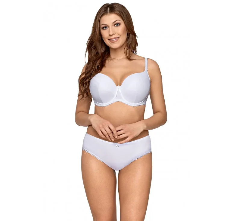 Vyztužená dámská podprsenka pro ženy s větším a plnějším poprsím. Model má dokonalý střih a konstrukci se svislými a šikmými švy. Podprsenka je vyrobená z hladkého mikrovlákna. V místě spojení košíčků je saténová mašlička. Ramínka není možné odepnout. Šířka ramínek je přizpůsobená velikosti a rozměru podprsenky. Model dokonale nadnáší poprsí a poskytuje mu oporu. Podprsenka má střih a konstrukci typu K-924. Složení: 88 % polyamid, 8 % bavlna, 4 % elastan.