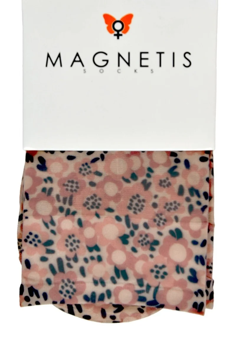 Model WZÓR 102 od značky Magnetis jsou jemné, průhledné ponožky s romantickým květinovým vzorem. Béžový základ zdobí pastelové květinové motivy v odstínech růžové, tmavě modré a zelené, které vytvářejí jemnou, ale přesto výraznou kompozici. Díky tloušťce 12 den a lehké struktuře jsou ponožky ideální pro teplejší dny a skvěle se hodí k balerínám, mokasínám nebo i k jehlovým podpatkům. Vysoký obsah polyamidu a elastanu zajišťuje dokonalé přizpůsobení a pohodlí při nošení..