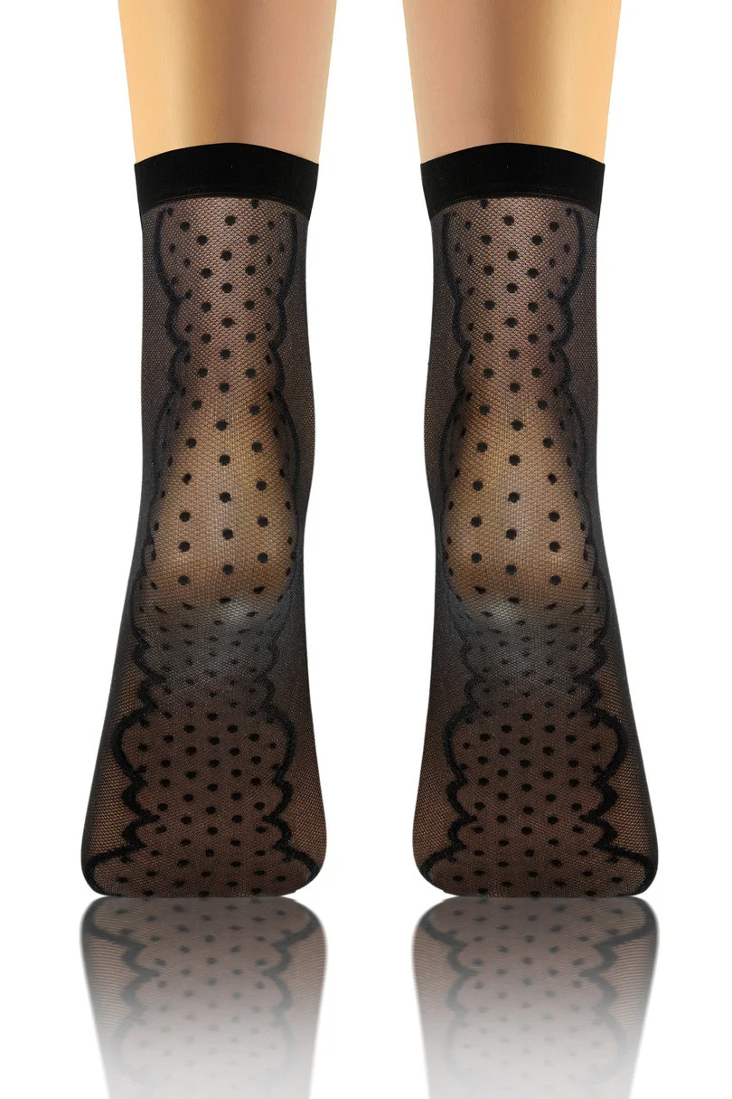 Skarpetki WZ 11 od Sesto Senso to wyjątkowy model, który łączy klasyczny urok groszków z nowoczesnym designem. Transparentna tkanina z drobnym, czarnym wzorem w kropki została urozmaicona dekoracyjnym, falistym konturem, który optycznie wysmukla nogę i dodaje finezji. Gładki, elastyczny ściągacz zapewnia komfort noszenia i pewne utrzymanie na nodze. Idealne zarówno do stylizacji codziennych, jak i bardziej eleganckich – sprawdzą się świetnie w towarzystwie czółenek, balerinek czy loafersów.