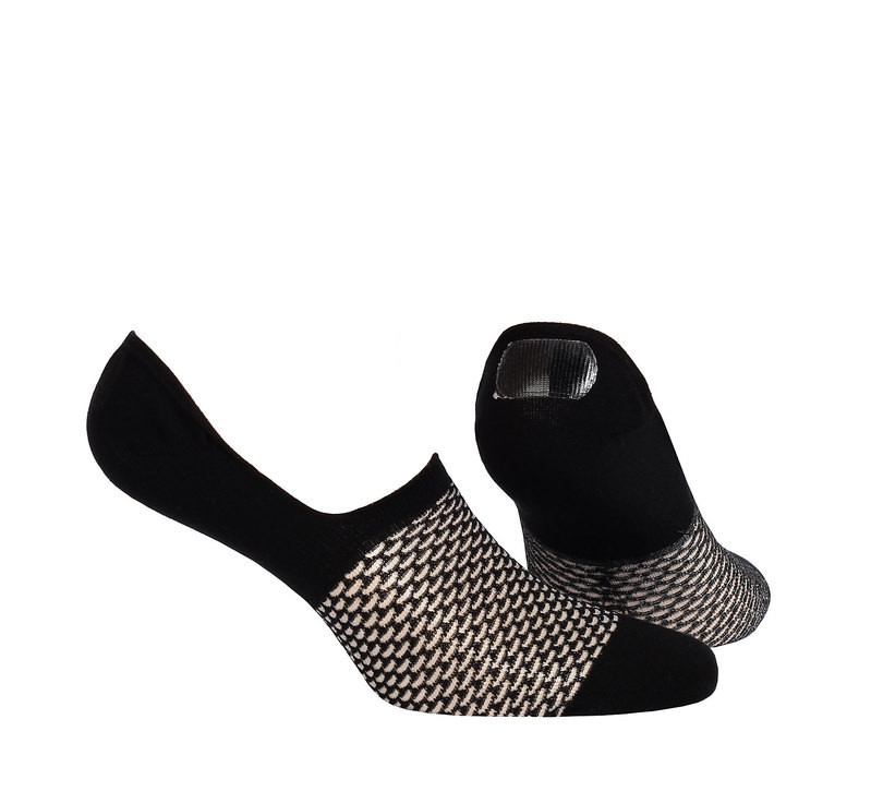 Neobyčejné dámské ponožky "mokasínky". Ponožky jsou vyrobené z pružné látky. Přední část modelu tvoří průsvitná puntíkovaná, nebo pruhovaná síťovina. Model má měkké švy, volné lemy a silikonový pásek na patě. Ponožky se ideálně přizpůsobují chodidlu a chrání jej před odřeninami. Složení: 73 % bavlna, 26 % polyamid, 1 % elastan.