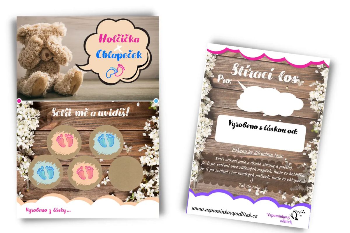 Kvalitně zpracované oboustranné oznámení v podobě stíracího losu. Design losů si tvoříme sami, při oznámení pohlaví tak budete naprosto originální.