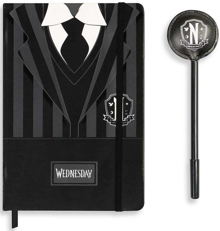 Sada diáře a pera s motivem Wednesday uniformy. Balení s kuličkovým perem a diářem v dárkové krabičce. 100stránkový diář s pevnou vazbou, záložkou a zavíráním na gumičku. Ozdobné kuličkové pero s horní siluetou.