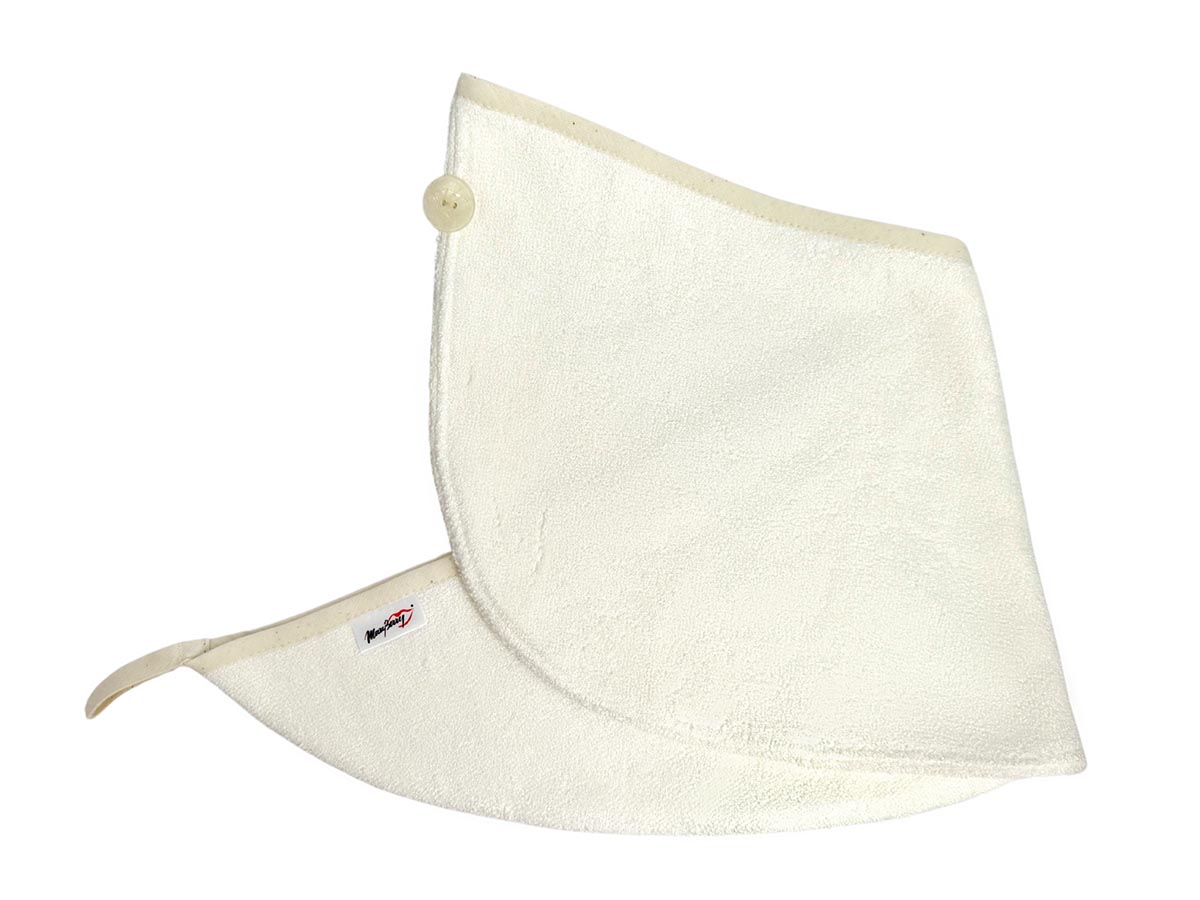 Turban je vyroben z luxusního froté ze 100% bavlny s větší gramáží, která zaručuje výbornou savost a skvěle drží tvar díky praktickému zapínání na knoflík v zadní části.