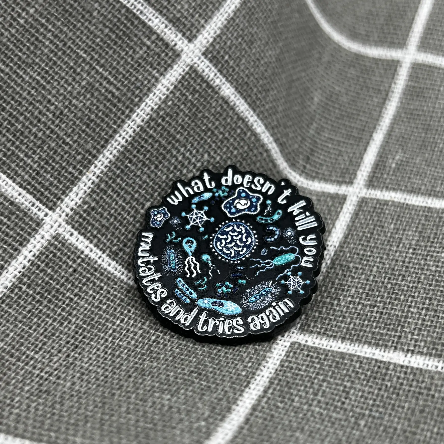 What doesn’t kill you mutates and tries again / Co tě nezabije, zmutuje a zkusí to znovu\nVtipný smaltovaný odznáček s motivem barevných virů a bakterií a ironickým nápisem „What doesn’t kill you mutates and tries again“. Ideální doplněk pro všechny milovníky černého humoru, biology, mediky, vědce nebo kohokoli, kdo má rád trefné hlášky s nadsázkou.\n📌 Kvalitní kulatý smaltovaný odznáček s výraznými barvami\n🦠 Design s mikroby a vtipným textem o mutacích\n🎒 Perfektní na batoh, tašku, klopu saka nebo mikinu\n🎁 Skvělý dárek pro studenty medicíny, biology i fanoušky humoru\nTento odznáček pobaví i připomene, že život má své „mutace“ – a že humor je nejlepší obranou.