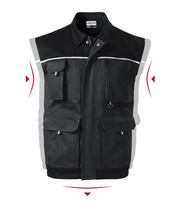 celopropínací kostěný zip s klopou záhyby na zadním dílu 8 multifunkčních kapes měchové kapsy s klopou a lištové kapsy na zip dolní okraj stažený pruženkou v boční části kovové "D" poutko na klíče a ID karty dvojité prošití pro vyšší odolnost retroreflexní prvky