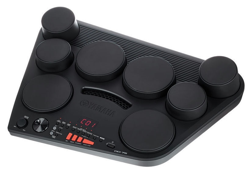Perkusní pad DD-75 je kompaktní digitální sestava bicích padů včetně pedálových ovladačů pro hi-hat a velký buben, která nabízí široký výběr realistických bicích (75 sestav) a deset dalších setů pro vlastní nastavení. Osm padů je na panelu v rozložení jako u klasické bicí soupravy a jejich individuální nastavení citlivosti (pět stupňů) oceníte při hře dlaněmi i klasickými paličkami. Vysoká konektivita umožňuje připojení externího audio zařízení pro nácvik skladeb oblíbených interpretů. Reprodukci zvuku zaji
