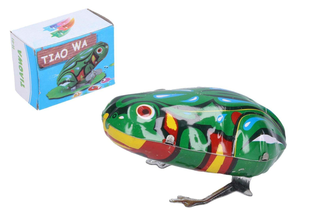 Pohyb plechové žabky zajišťuje pérový strojek natahovaný klíčkem. Rozměry balení 7 x 5 x 4 cm. Vhodné pro děti od 3 let.