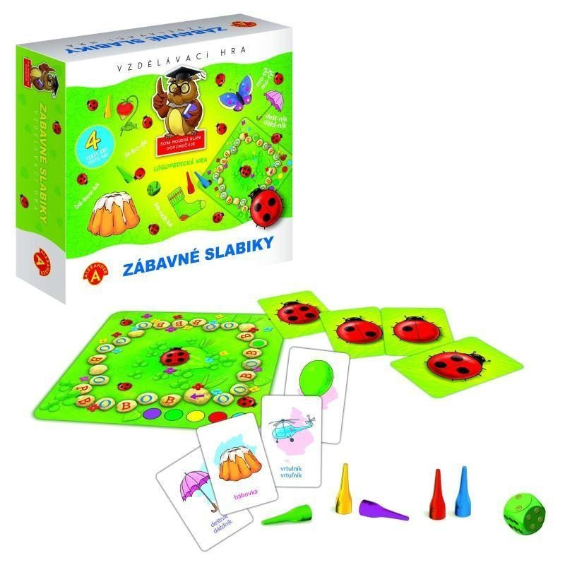 „Zábavné slabiky” je na učná hra pro děti od 5let, která rozvíjí fonémový sluch (dovednost hláskové analýzy a syntézy výrazů). Zaměřuje se i na zrakově – sluchově – pohybovou koordinaci a sluchovou koncentraci, které jsou velmi důležité při výuce čtení a psaní. Učí rovněž dodržovat dohodnutá pravidla. Hru mohou používat nejen logopedové, pedagogové a terapeuti, ale také rodiče, kteří chtějí dobu společně strávenou s dítětem věnovat zábavě vzdělávacího charakteru. Obsah balení: karty „berušky“ – 55 ks, karty s obrázky – 55 ks, 1x hrací deska, figurky – 5 ks, 1x hrací kostka, český a slovenský návod ke hře
