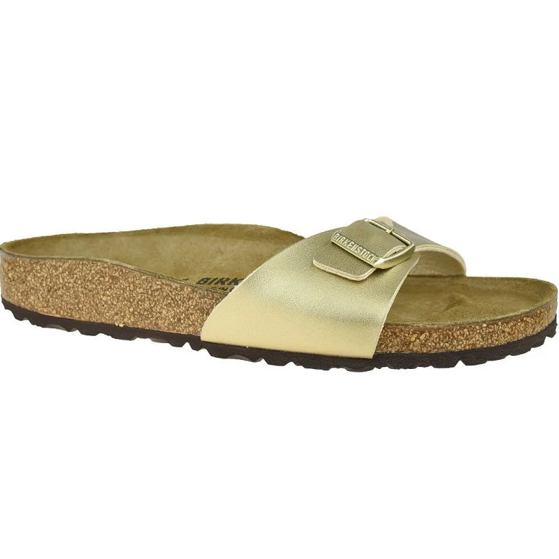 Žabky Birkenstock Madrid BF 1016107 Vlastnosti: Vhodný pro děti od 3 let: výše uvedená obuv Madrid je verze žabek speciálně navržená pro lidi s úzkými, štíhlejšími chodidly (u obuvi Birkenstock existují dva typy šířky) tajemstvím žabek Birkenstock je rozhodně anatomicky tvarovaná stélka, která se dokonale přizpůsobí chodidlu v jeho přirozené poloze prsty a střední část chodidla jsou polstrované, zatímco oblast paty je zapuštěná, takže chodidlo je vždy na správném místě, což zajišťuje naprostou stabilitu a rovnováhu takovéto profilování posiluje lýtkové svaly a stimuluje krevní oběh, takže obuv lze nosit mnoho hodin a bude bezpečná pro naše klouby Materiál: materiál: syntetika Barva: syntetická, syntetická, syntetická, syntetická, syntetická, syntetická, syntetická: barva: zlatá